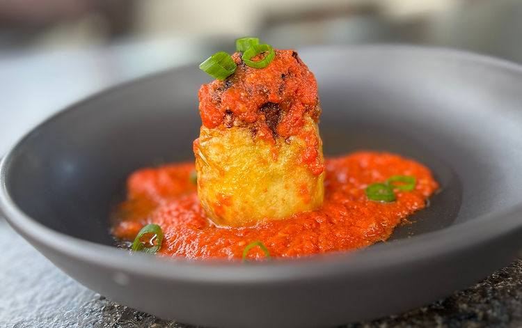 Stuff potatoes with meat and pesto. Layer everything in the baking dish and cover with sauce. Bake for 20-25 min @ 400°F.Â