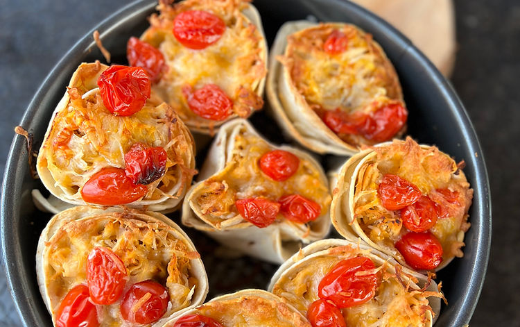 Make one cut on the tortilla from center to the side, spread some ricotta cheese on top and roll it into a cone. Fill the cone with pulled chicken, sprinkle shredded cheese and sliced cherry tomatoes on top. Put taco cones in the baking dish, sprinkle some oil and bake at 380°F for 20 minutes.Â